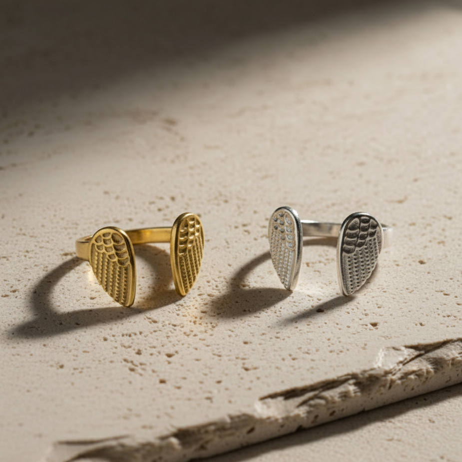 Cette bague ajustable en acier inoxydable est une pièce délicate et symbolique. Son anneau est orné de deux ailes d'ange finement détaillées, pour un look à la fois doux et protecteur. Ce bijou est parfait pour un usage quotidien ou pour offrir en cadeau à une personne chère. Disponibles en deux variantes : argentée et dorée.