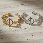 Cette bague ajustable en acier inoxydable est une pièce de design moderne et audacieux. Son anneau doré est orné d'un motif composé d'une barrette et d'un anneau, pour un look à la fois chic et original. Ce bijou est idéal pour un style contemporain et minimaliste. Disponibles en deux variantes : argentée et dorée.