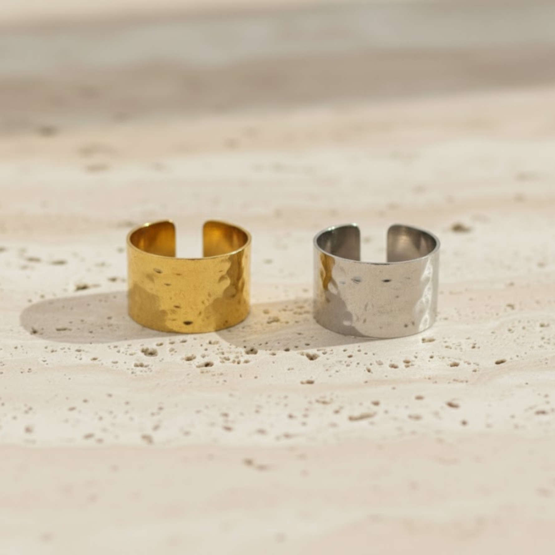 Cette bague ajustable en acier inoxydable est une pièce de design moderne et audacieux. Son anneau large présente une finition martelée et texturée, créant un effet de relief qui capte la lumière. Ce bijou, à la fois tendance et intemporel, est parfait pour un style chic et original. Disponibles en deux variantes : argentée et dorée.