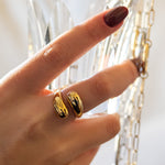 Cette bague ajustable en acier inoxydable est une pièce de design moderne et audacieux. Son anneau doré et lisse s'enroule autour du doigt, créant un effet torsadé et une surface miroir qui reflète la lumière avec élégance. Ce bijou est parfait pour un style contemporain et minimaliste.