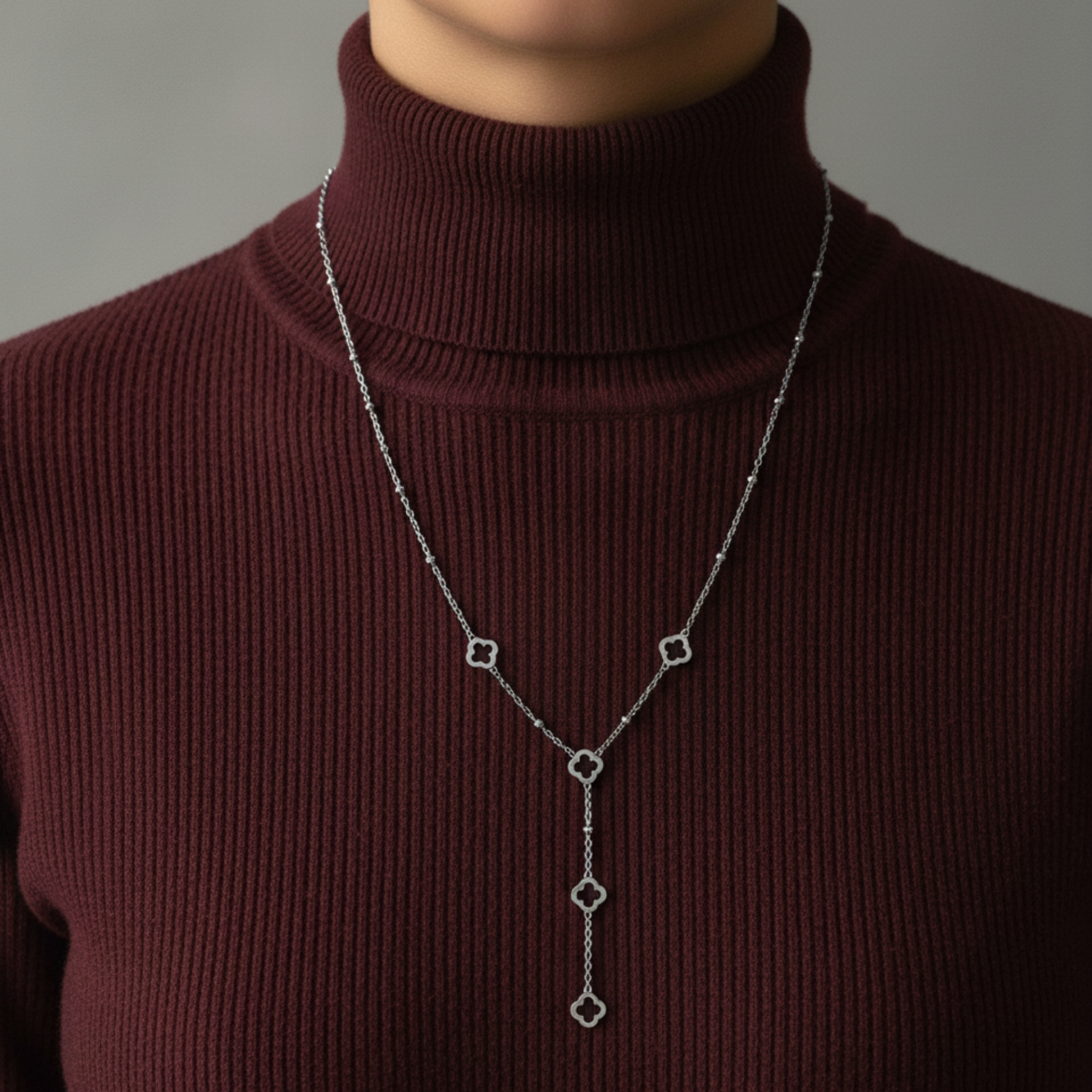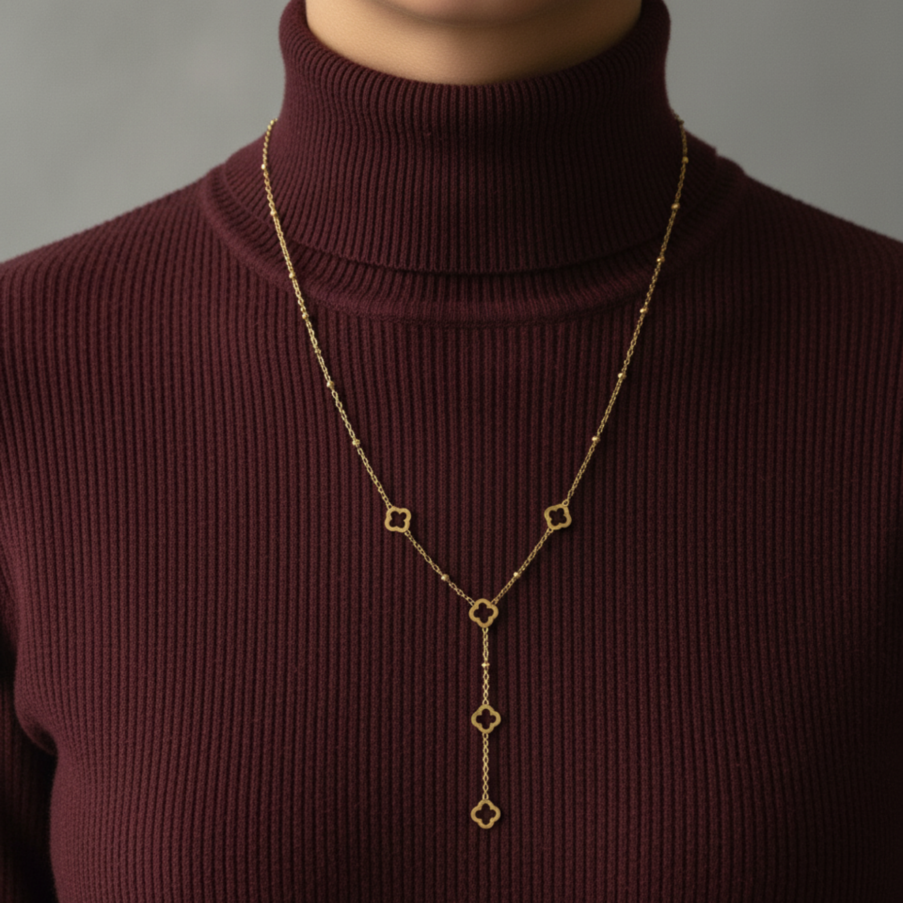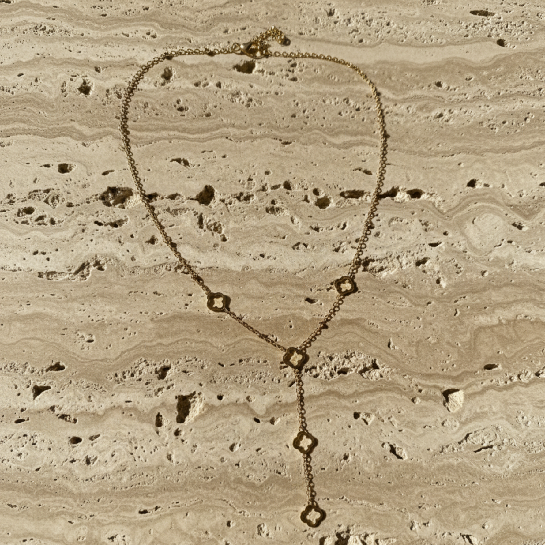 Ce collier TRÈFLES en acier inoxydable est une ode à la nature et à la féminité. La chaîne dorée est agrémentée de délicats trèfles. Ce bijou tendance et élégant mettra en valeur votre cou et sublimera vos tenues.