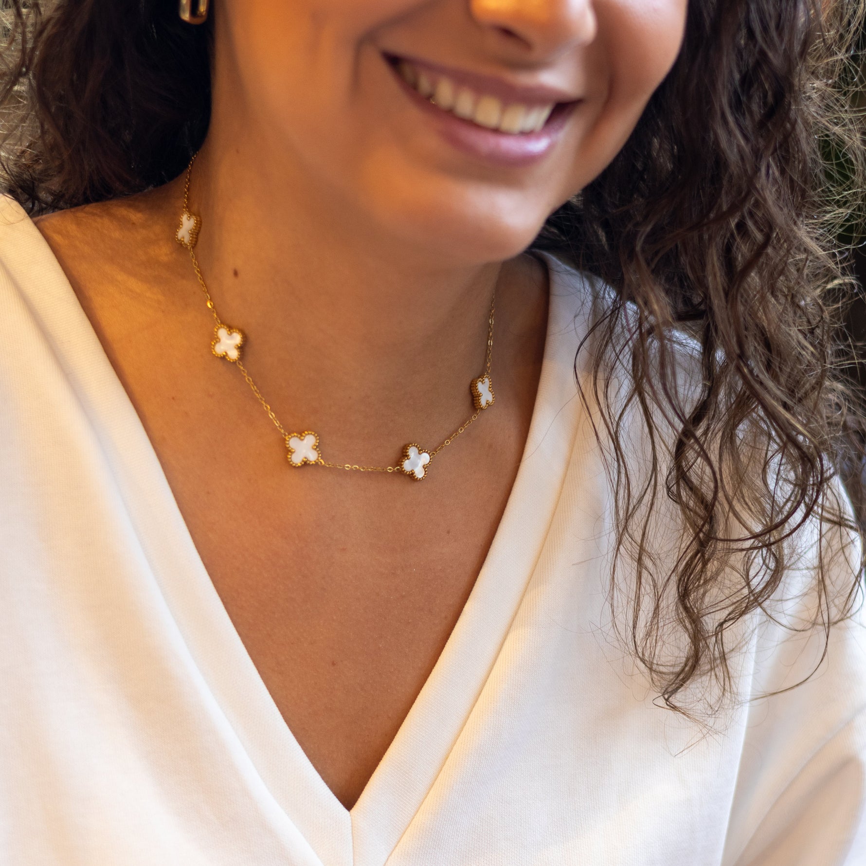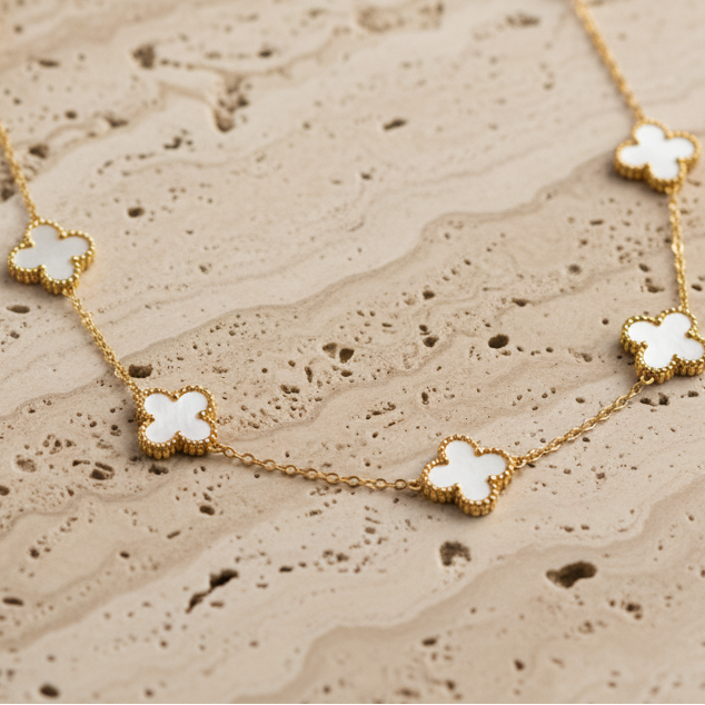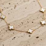 Ce collier ras du cou en acier inoxydable est l'accessoire parfait pour une touche de raffinement et d'élégance. Il se compose d'une chaîne dorée fine ornée de plusieurs pendentifs en forme de trèfles à quatre feuilles en nacre blanche. Le contraste entre le doré éclatant de la chaîne et la finition irisée de la nacre crée un look à la fois classique et tendance.